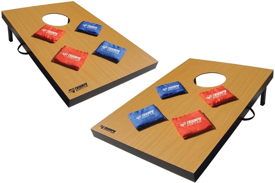 Cornhole is a lawn game in which players take turns throwing 16 ounce bags of corn kernels at a raised platform with a hole in the far end. The object of the game is to score points by throwing beanbags onto, or through the hole of, the Cornhole Board opposite from you. Points are scored at the end of each frame, after both teams on the same side have each thrown four beanbags. A bag in the hole scores 3 points, while one on the board scores 1 point. Play continues until a team or player reaches or exceeds the score of 21.