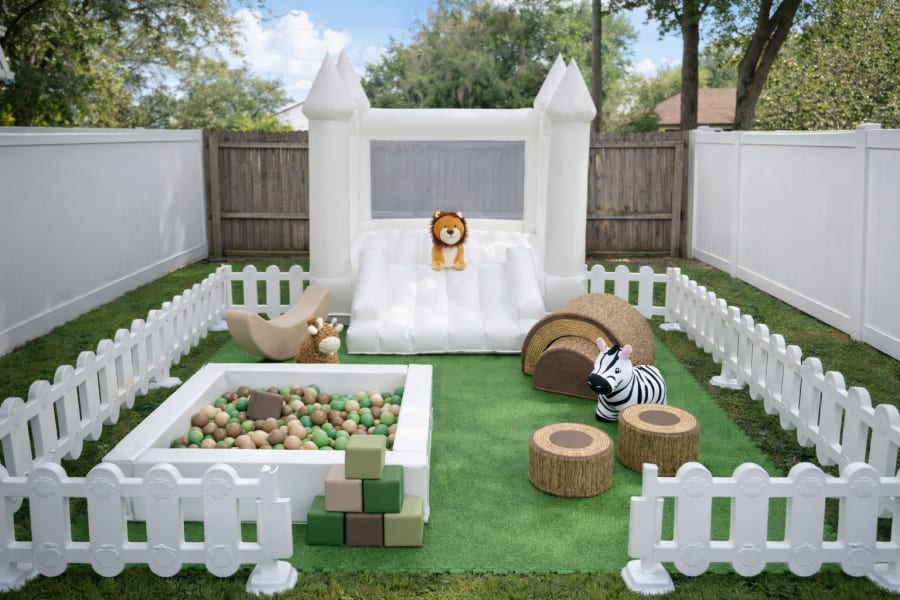 Create a magical play experience with our Enchanted Combo, a beautifully curated soft play and white mini toddler bounce house rental designed especially for little ones. This versatile setup is fully customizable to match any theme or color palette, making it perfect for toddler birthdays. The Enchanted Combo includes a modern white toddler bounce house paired with engaging soft play elements that encourage safe exploration, movement, and imaginative play. Little guests will love bouncing, climbing, rocking, crawling, and building in a clean, padded play space designed just for them.