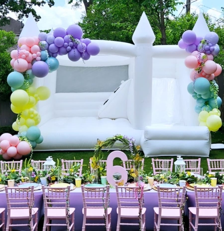 Let the FuN begin with our all-inclusive party rental package, you can sit back, relax, and enjoy your event while we take care of everything. Our package includes a wide range of party essentials, ensuring that your celebration is memorable! Keep them entertained for hours with our modern bounce house castle! ALL INCLUSIVE Package includes: Modern WHITE Bounce House w/ Slide, Decorated Kids Table w/16 Chiavari Chairs and 14ft Balloon Garland!