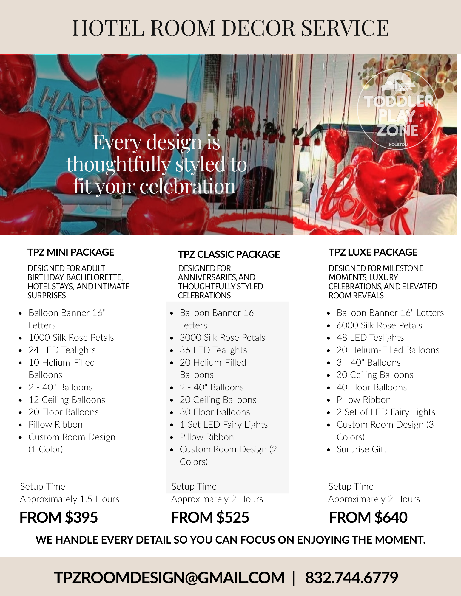 Romantic hotel room setups book quickly, especially for weekends and holidays. Reserve your date early and let us create a magical experience you’ll never forget. 💕 Contact us for more information at 832.744.6779 or TPZRoomDesigns@gmail.com